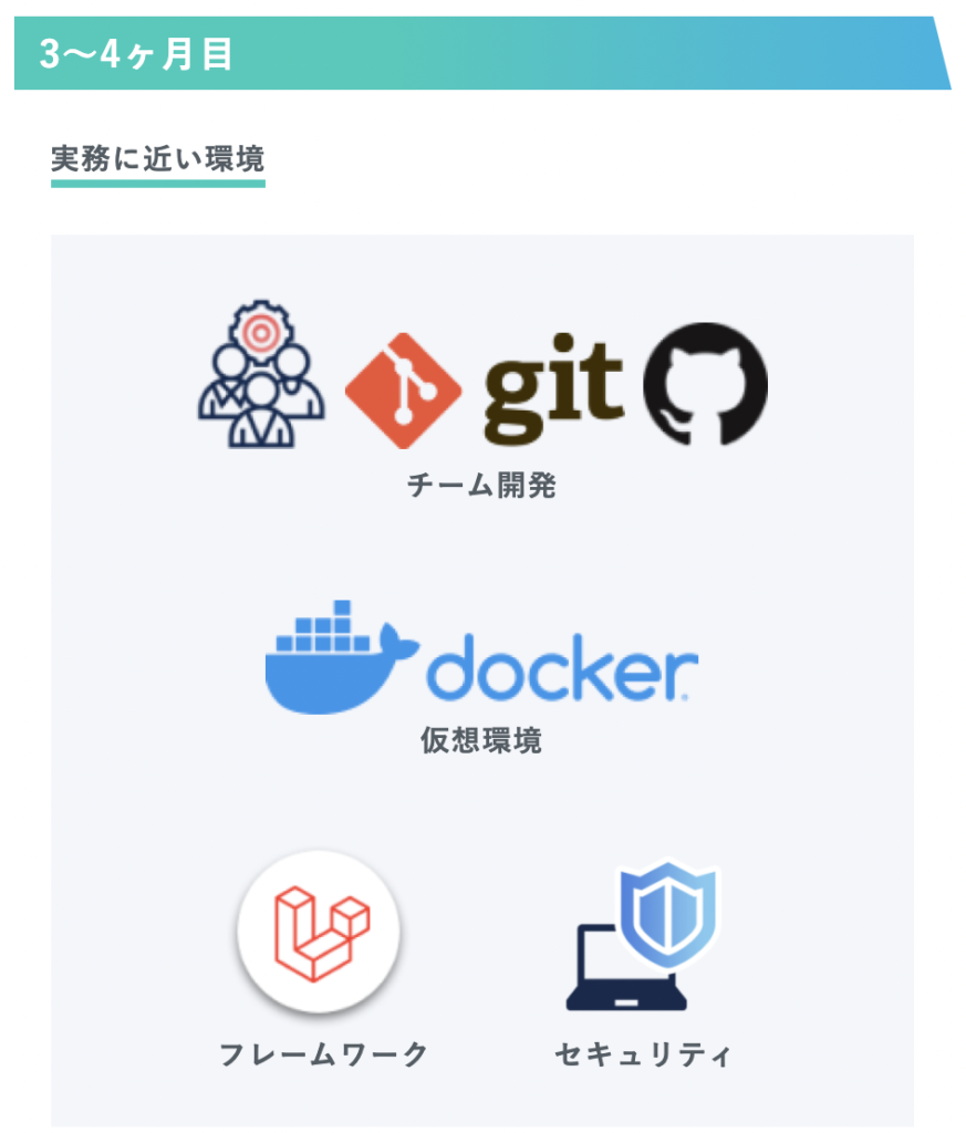 チーム開発の実施や必要なツール(Git,Github)の理解、仮想環境の構築やセキュリティ管理、自分だけではなく誰もが読むことができる高品質なコーディング等、実際の開発現場に即したスキルを身につけていきます。付録課題としてPHPのフレームワークであるLaravelに取り組むこともできます。