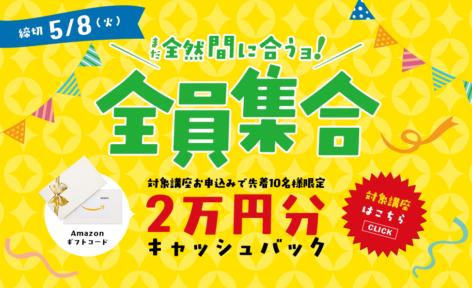 対象講座限定先着20名様受講料20%OFF+20人に1人全額キャッシュバック (2月)