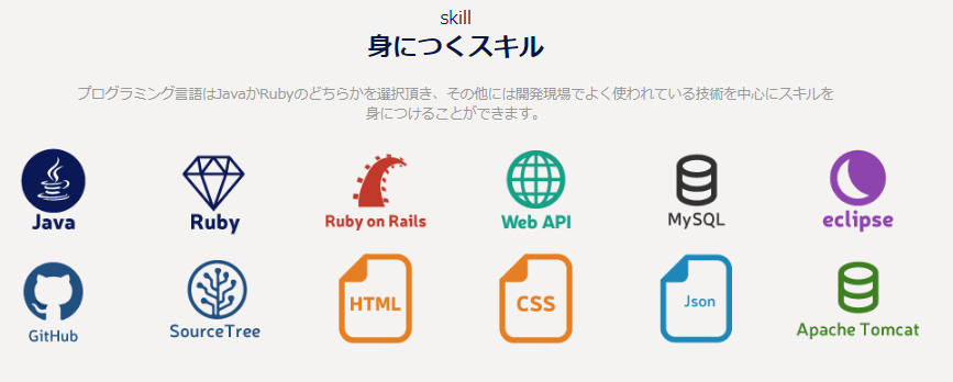 JavaかRubyを選択し基本的な四則演算や変数・定数・フレームワークなどを学ぶことができます。