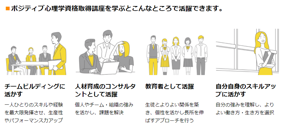 ポジティブ心理学をもとに、資格取得やコーチングスキルについて学ぶことができます。