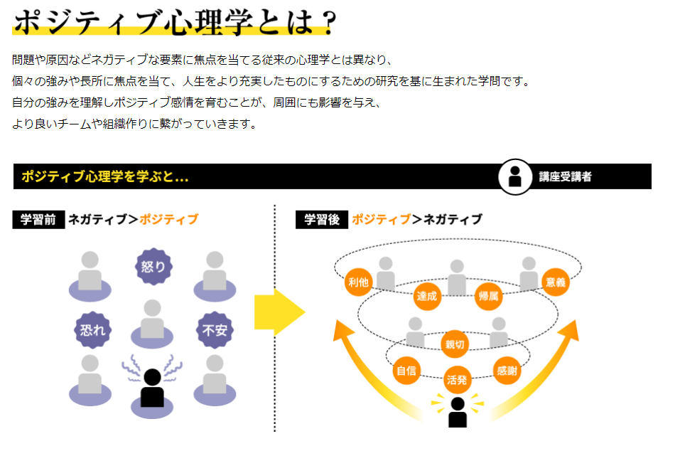 ポジティブ心理学により、人の強みを引き出すコーチングスキルを身につけ、人材育成やチームビルディングに活かせるようになることが期待されます。