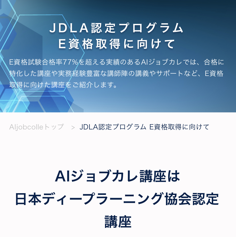 ここで、JDLA認定プログラムとは、JDLA(日本ディープラーニング協会)が実施するE資格の受験資格を得るために受講・修了が必須の教育プログラムです。