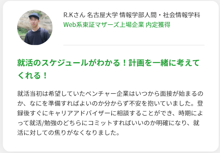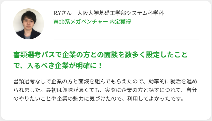 登録から内定獲得までの期間は最短2週間です。複数の企業を同時並行で進めることが出来て、特別選考があるので早く内定が決まっています。利用者の声でも書類選考をパス出来て面談からという記載がありました。特別選考に乗りたい人にはおすすめです。