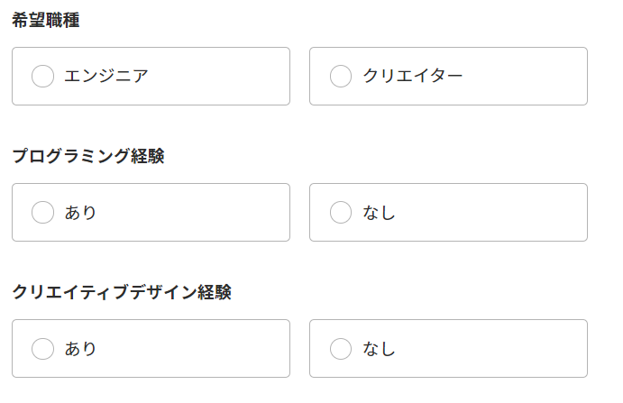 会員登録では変わった設問はありませんが、以下のように、希望職種やプログラミング経験が聞かれます。経験に応じて紹介する企業も変わってくると思うので、正直に答えましょう。
