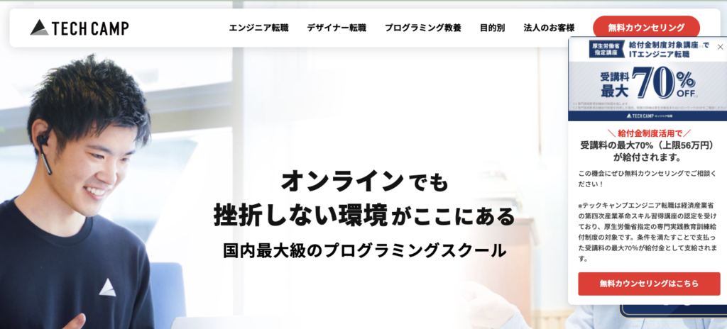 テックキャンプのエンジニア転職だと、教育訓練給付金の対象になるので、最大56万円お得に通うことができます。