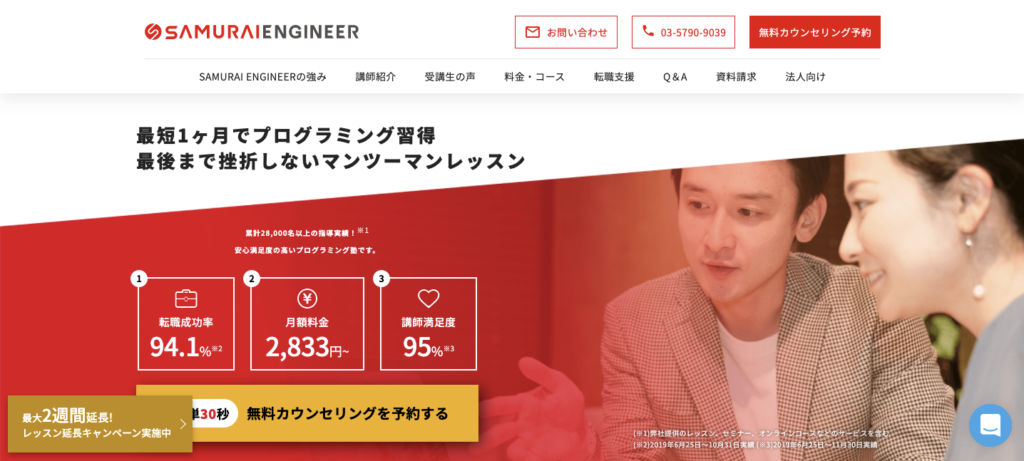 「挫折が怖い」と思う方は、プログラミングスクールを活用するのも目指す方法の一つです。以下で紹介するプログラミングスクールは、プログラミングスキルの基礎から学び、最終的には実践的な力を身につけることができるカリキュラムとなっています。特にマンツーマン指導のプログラミングスクールはモチベーションの維持までみてくれるのでおすすめです。