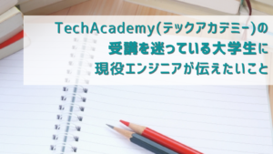 テックアカデミーの受講を迷っている大学生に現役エンジニアが伝えたいこと【学割あり!】 プログラミングスクールの受講を悩んでいる大学生に、大学生がプログラミングを学ぶことがおすすめな理由を現役エンジニアの目線から解説しています。値段が高いなと思っている場合は、大学生専門のプログラミングスクールに通うことをおすすめします。ガクチカをプログラミングにして、就活を有利に進めましょう!