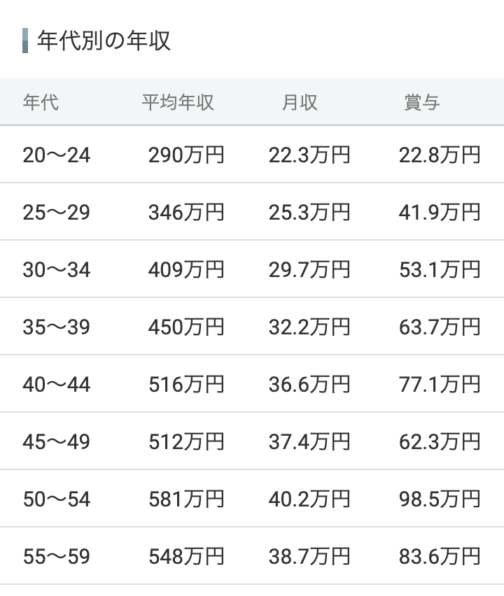 年代別データは「賃金構造基本統計調査」からの引用となっています。UI/UXとも同じデータとなっています。年代別で見ると、50〜54歳が一番高くなっています。一方、20〜24歳が一番低くなっています。とはいえ、40代までは平均年収が上昇しています。これは年齢が上昇するとともにスキルもアップし、それに伴い年収がアップしているものと推測されます。