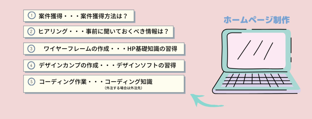 例えばHP制作を習得したいならHPの基礎知識・ワイヤーフレーム / デザインカンプの作成方法 / クリエイターソフトの習得などが必要になってきます。